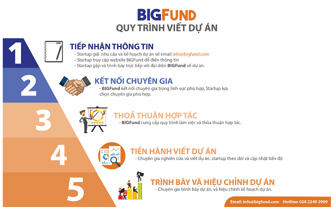 Quy trình này gồm 5 bước, bao gồm bước 1: Tiếp nhận thông tin (Startup gửi nhu cầu về dự án tại đây, truy cập website để điền thông tin, gặp và trình bày trực tiếp với BIGFund về dự án); bước 2: Kết nối chuyên gia, bước 3: Thỏa thuận hợp tác, bước 4: Tiến hành viết dự án và bước 5: Trình bày và hiệu chỉnh dự án.