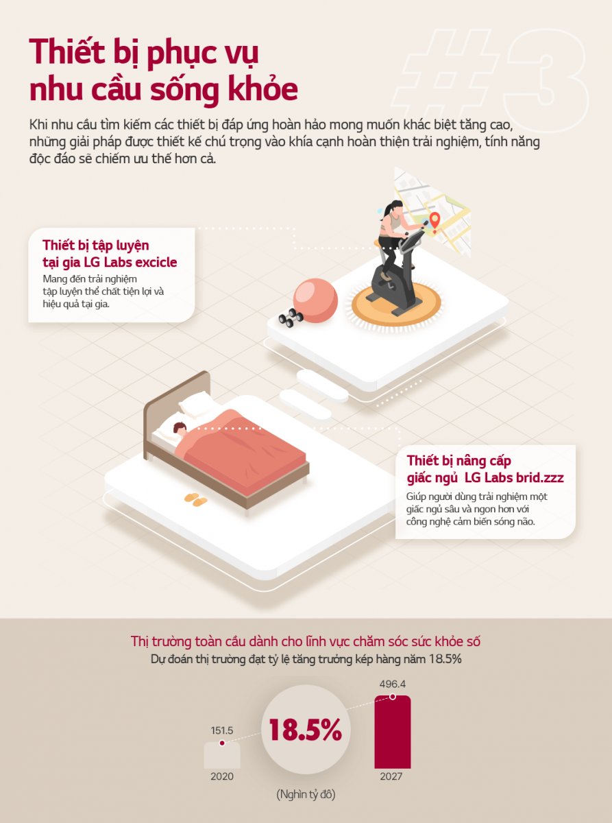 Nhìn theo hướng tích cực, đại dịch là lời nhắc nhở thiết thực giúp con người quan tâm hơn đến sức khỏe thể chất và tinh thần của chính mình và những người xung quanh. Từ đó, người dùng mong muốn tìm kiếm những giải pháp chăm sóc sức khỏe hiệu quả giúp họ chủ động hơn trong việc xây dựng nền tảng đề kháng và duy trì lối sống khỏe mỗi ngày tại gia với chi phí hợp lý. Sản phẩm điều hòa lọc khí LG DUALCOOL hay máy lọc không khí kết hợp quạt LG PuriCare AeroTower là những gợi ý điển hình người dùng nên tham khảo khi quan tâm đến lối sống khỏe mạnh.