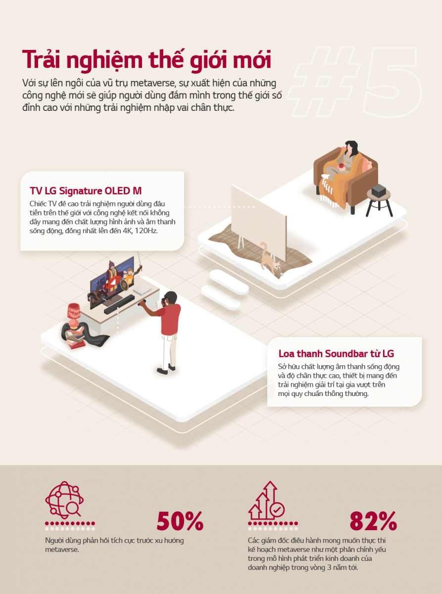 Có thể nói, chính những kỳ vọng của người dùng là động lực lớn thúc đẩy sức phát triển vượt bậc của các hãng điện tử dân dụng hàng đầu như LG, từ đó mang đến các thiết bị công nghệ đỉnh cao giúp người dùng đắm mình trong môi trường số chân thực cũng như hứa hẹn tạo được tiếng vang lớn trong năm 2023. Tham khảo thêm các thiết bị giải trí và gia dụng hàng đầu của LG tại tại đây .