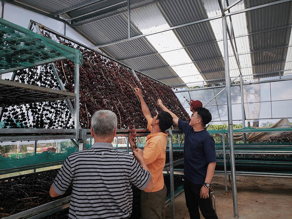 Theo đó, cà phê nguyên liệu Khánh chọn từ vườn anh Lực là một tấn tuyển từ 20 tấn hạt, đều chín đỏ. Trong quá trình quan sát những trái bưởi, trái quýt còn nguyên cuống sẽ giữ được lâu hơn, Khánh và cộng sự đã thử nghiệm 'cà phê treo cành' - bằng cách cắt nguyên cành cà phê chín về treo lên phơi.