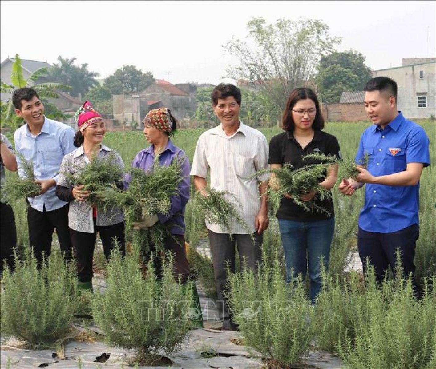 Vũ Thị Thu đang giới thiệu với thanh niên về các cây thảo dược dùng để chiết xuất ra các sản phẩm. Ảnh: Thái Hùng/TTXVN
