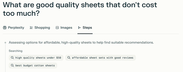 Ví dụ, khi công cụ trả lời bằng AI Perplexity nhận được câu hỏi “Những loại ga trải giường chất lượng tốt mà giá cả không quá cao là gì?”, nó sẽ dịch câu hỏi đó thành ba truy vấn phân nhánh: ga trải giường chất lượng cao dưới 50 đô la; bộ ga trải giường giá cả phải chăng với đánh giá tốt; ga trải giường cotton giá rẻ tốt nhất