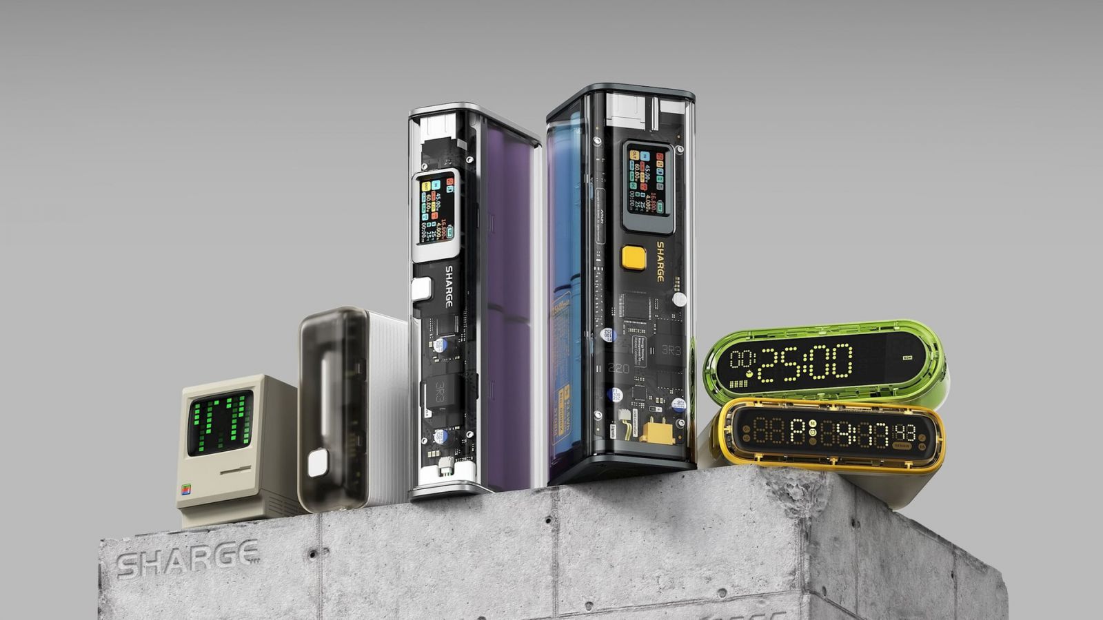 Thiết kế độc đáo của Sharge lấy cảm hứng từ iMac G3 của Apple, một sản phẩm với lớp vỏ trong suốt, cho phép người dùng nhìn thấy bên trong. Vậy nên các mẫu sạc dự phòng của Sharge cũng được thiết kế theo kiểu phô bày bảng mạch in (PCB), chip, pin và các linh kiện khác, mang lại vẻ ngoài rất “tương lai, công nghệ cao”. Thiết kế này không chỉ thu hút những người tò mò về mặt hình ảnh mà còn giúp người dùng dễ dàng nắm bắt cấu trúc và chức năng sản phẩm. Thậm chí một số mẫu còn tích hợp màn hình hiển thị đa chức năng, cung cấp thông tin thời gian thực.