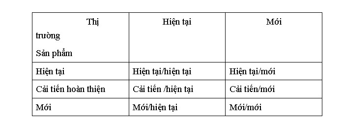 Như vậy, thực chất của hai chiến lược là phải giải bài toán về cặp sản phẩm thị trường. Ma trận cặp sản phẩm/thị trường được thể hiện như sau: