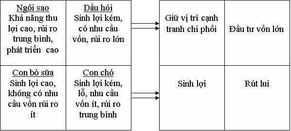 Dựa vào sơ đồ ma trận BCG, tương ứng từng vị trí ta có các chiến lược sau: