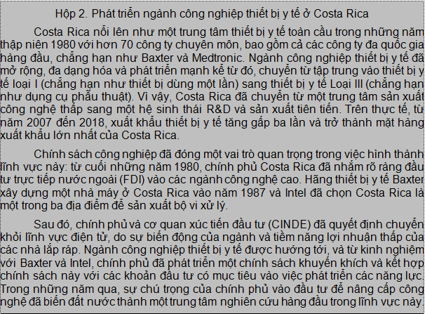 Vắc xin, thuốc sinh học miễn dịch và thiết bị y tế có mức độ công nghệ phức tạp khác nhau và liên quan đến nhiều lĩnh vực khoa học, ngành và công nghệ. Ví dụ, các thiết bị y tế bao gồm từ những sản phẩm có độ phức tạp tương đối thấp như thiết bị bảo vệ dùng một lần như khẩu trang và găng tay, cho đến các sản phẩm đòi hỏi năng lực sản xuất tinh vi hơn, chẳng hạn như dụng cụ phẫu thuật, thiết bị trị liệu và chẩn đoán. Tuy nhiên, ngay cả trong trường hợp thiết bị dùng một lần, công nghệ sản xuất những sản phẩm như vậy ở quy mô, tốc độ và độ tin cậy cũng có thể cực kỳ phức tạp. Do đó, bước nhảy vọt trong ngành thiết bị y tế là một thách thức. Tuy nhiên, đối với những công ty tham gia vào lĩnh vực này ở các nền kinh tế công nghiệp mới nổi và đang phát triển, sẽ có rất nhiều cơ hội học tập. Ví dụ, trường hợp của Costa Rica (xem Hộp 2) nêu bật cách các mà các nền kinh tế công nghiệp mới nổi và đang phát triển thúc đẩy đầu tư trong nước và nước ngoài để nâng cấp công nghệ, kỹ năng và cơ sở hạ tầng trong ngành thiết bị y tế và khai thác nhu cầu ngày càng tăng của thế giới đối với các sản phẩm y tế. Hiệu ứng cấp số nhân từ chiến lược này không đáng kể. Có thể thiết lập mối liên kết ngược với một số ngành, chẳng hạn như ngành hóa chất, cao su và dệt may, trong khi nhu cầu về máy móc có thể kích thích các ngành như máy công cụ và điện tử.