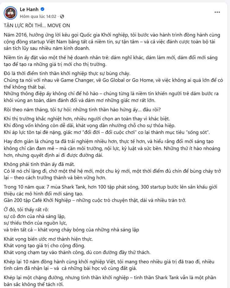 Mới đây, trên trang cá nhân, bà Lê Hạnh – CEO TV Hub – đơn vị sản xuất chương trình Shark Tank Việt Nam - đã đăng tải bài viết dài mang tựa đề "TẬN LỰC RỒI THÌ… MOVE ON", sau hành trình 10 năm đồng hành cùng cộng đồng khởi nghiệp Việt.