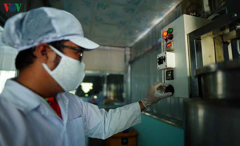 Phan Minh Tiến vận hành máy móc xử lý nguyên liệu.