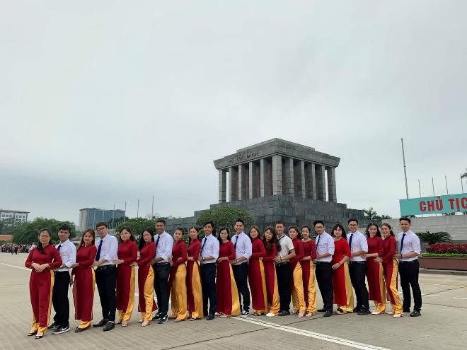 Huy và các bạn khoa du Lịch (thuộc Viện Kinh doanh - Quản lý) Đại học Quốc tế Hồng Bàng chụp ảnh kỷ niệm tại lăng Bác trong chuyến thực tập kết thúc môn.