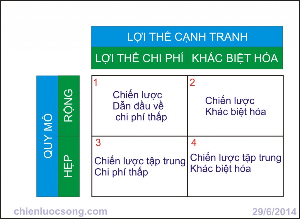 Quy mô rộng có nghĩa là SBU hướng tới thị trường rộng. Khi DN theo chiến lược dẫn đầu về chi phí thấp ở một quy mô rộng thì nhược điểm là khó cạnh tranh với các DN có chiến lược tập trung vào các phân khúc xác định (tạo lên thị trường) vì vậy phải là doanh nghiệp lớn mới có thể áp dụng chiến lược này.