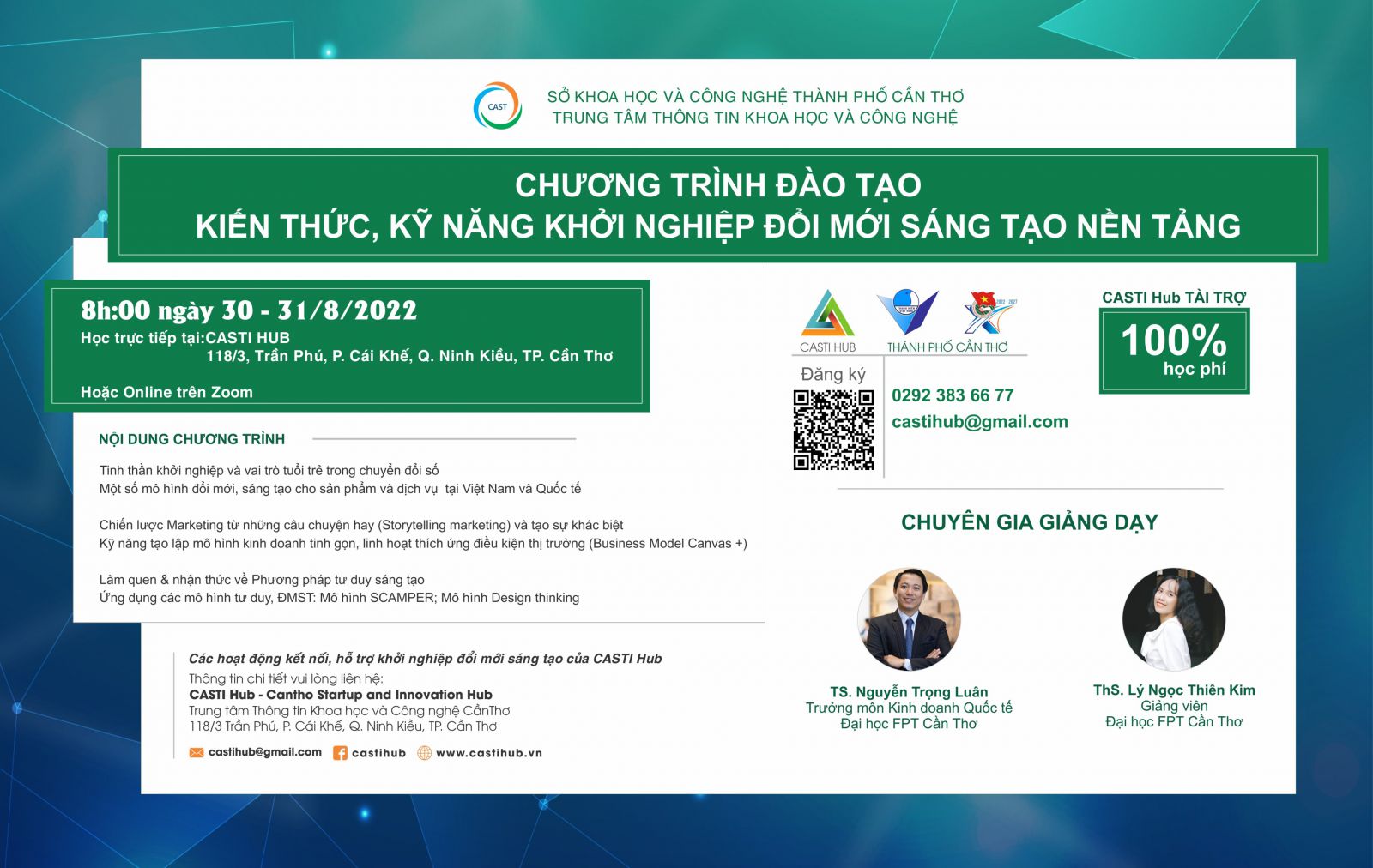 Thực hiện Kế hoạch số 135/KH-UBND ngày 30 tháng 6 năm 2021 của Ủy ban Nhân dân thành phố Cần Thơ về “Hỗ trợ phát triển hệ sinh thái khởi nghiệp đổi mới sáng tạo thành phố Cần Thơ giai đoạn 2021 – 2025, định hướng đến năm 2030”. Nhằm trang bị kiến thức, kỹ năng nền tảng về khởi nghiệp đổi mới sáng tạo, công cụ cơ bản để xây dựng ý tưởng khởi nghiệp, phát triển dự án khởi nghiệp đổi mới sáng tạo dựa trên thế mạnh của cá nhân và quan sát nhu cầu thị trường; tạo tâm thế, sự chuẩn bị trước về tư duy, nguồn lực cần có để chủ động trong quá trình khởi nghiệp đổi mới sáng tạo, Trung tâm Thông tin Khoa học và Công nghệ thuộc Sở Khoa học và Công nghệ TP. Cần Thơ tổ chức Chương trình đào tạo “Kiến thức, kỹ năng khởi nghiệp đổi mới sáng tạo nền tảng”.