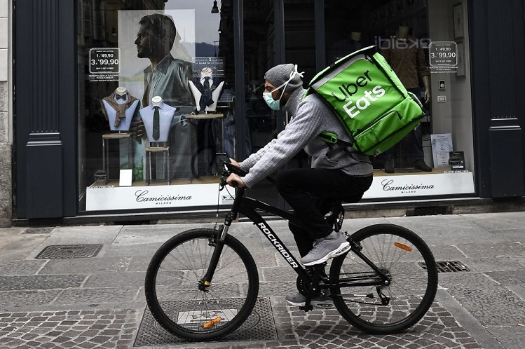Nhân viên của hãng Uber Eats được trang bị khẩu trang khi đi giao hàng. |