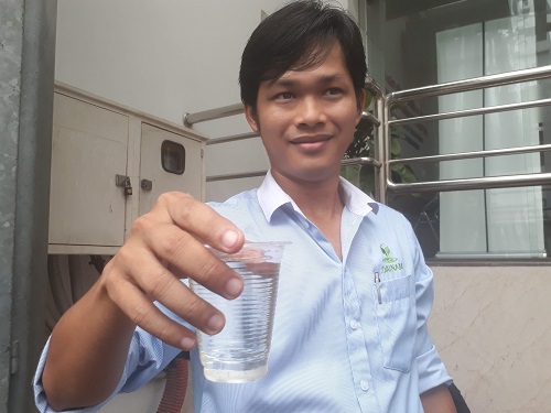 Th.s Ngô Quang Hiếu cầm trên tay ly nước thải ra môi trường sau khi qua xử lý tại Viện gút TP.HCM. Ảnh: Hà Thế An.
