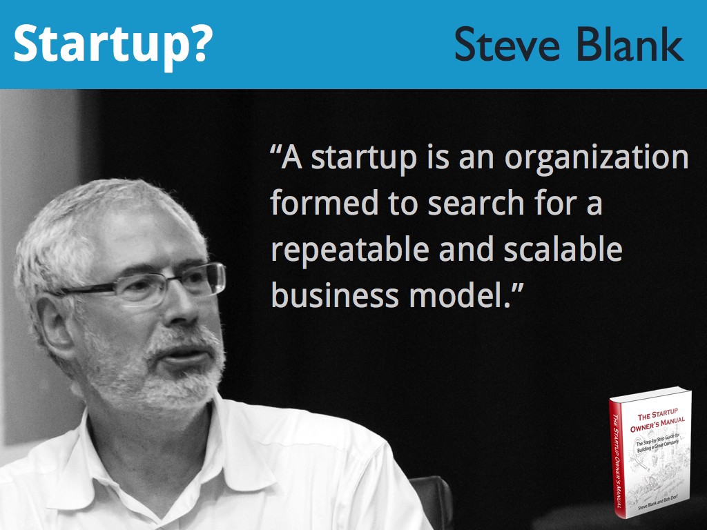 Định nghĩa được chấp nhận rộng rãi nhất hiện nay của startup là “startup là tổ chức được tạo thành để tìm kiếm mô hình kinh doanh có khả năng tái lặp & nhân rộng". Định nghĩa này do Steve Blank, cây đại thụ trong giới khởi nghiệp trên thế giới. Steve cũng chính là mentor của Eric Ries. Steve là người truyền cảm hứng để Eric viết nên cuốn sách nổi tiếng khắp thế giới — Lean Startup.
