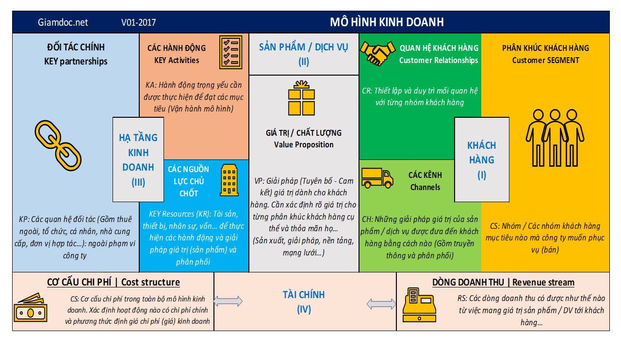 Tại sao khung mô hình kinh doanh (business model canvas) là quan trọng? Hãy nhìn vào mô hình ở trên, bạn sẽ thấy chỉ với 1 trang giấy ngang được bố trí với 9 thành tố của 4 khu vực (trụ chính) trong doanh nghiệp mà nó có thể biểu diễn khả năng kinh doanh thành công hay không? Xác định được vị thế cạnh tranh, phạm vi khách hàng (hoặc phạm vi của chiến lược) cũng như có & sử dụng nguồn lực nào. Ta cùng đi vào chi tiết hơn từng thành tố: