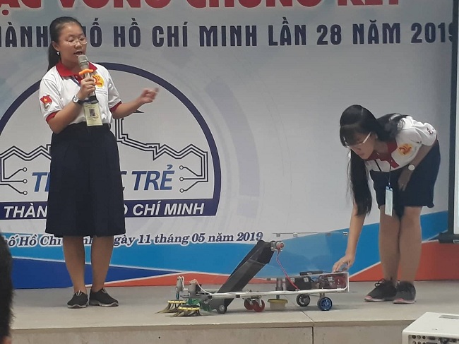 Cũng quan tâm đến vấn đề về môi trường, nhóm học sinh Nguyễn Trương Mai Phương, Tăng Thanh Hà, Lương Bảo Ngọc, trường THCS Cách Mạng Tháng Tám (Q.10) đã tạo ra một máy dọn rác tự động. Những chiếc chổi quét và cơ cấu cuộn của máy sẽ lấy toàn bộ rác ở phạm vi hoạt động đưa lên khoang chứa. Các loại rác cũng sẽ được tự phân loại trong khoang chứa giúp người phụ trách dễ xử lý hơn.