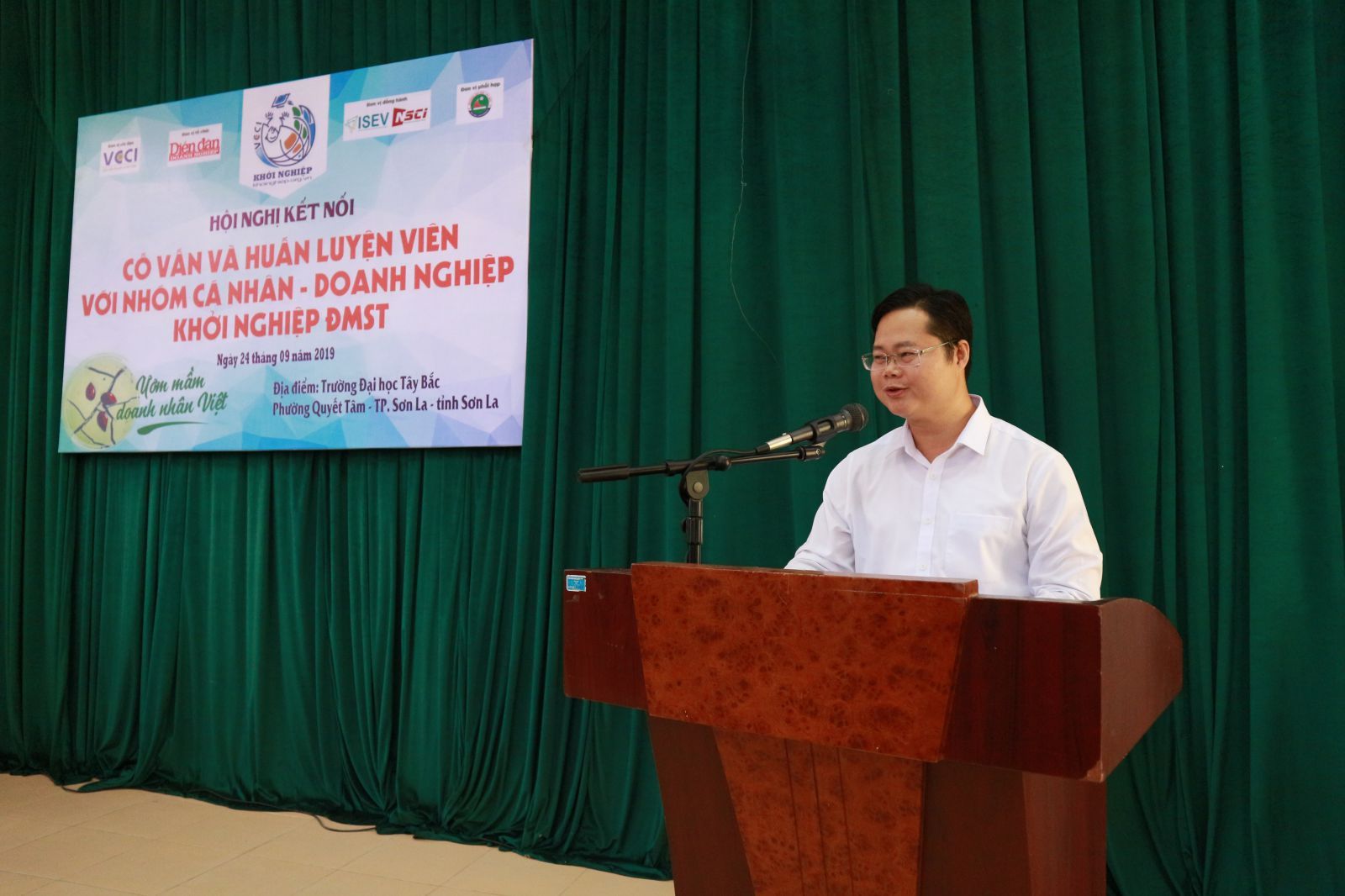Phát biểu khai mạc Hội nghị, TS. Hoàng Xuân Trọng - Phó Trưởng khoa Kinh tế, Trường Đại học Tây Bắc cho biết, Trường Đại học Tây Bắc rất vinh dự khi nhận được sự quan tâm của Uỷ ban nhân dân tỉnh Sơn La, Hiệp hội Doanh nghiệp tỉnh Sơn La; Báo Diễn đàn Doanh nghiệp, Chương trình Khởi nghiệp Quốc gia; Công ty CP Tư vấn và Đầu tư Khởi nghiệp Quốc gia (NSCI) đã tin tưởng lựa chọn nhà trường là đơn vị phối tổ chức 02 Khoá tập huấn kỹ năng huấn luyện khởi nghiệp đổi mới sáng tạo và Hội nghị kết nối cố vấn và huấn luyện viên với nhóm cá nhân - doanh nghiệp khởi nghiệp đổi mới sáng tạo.