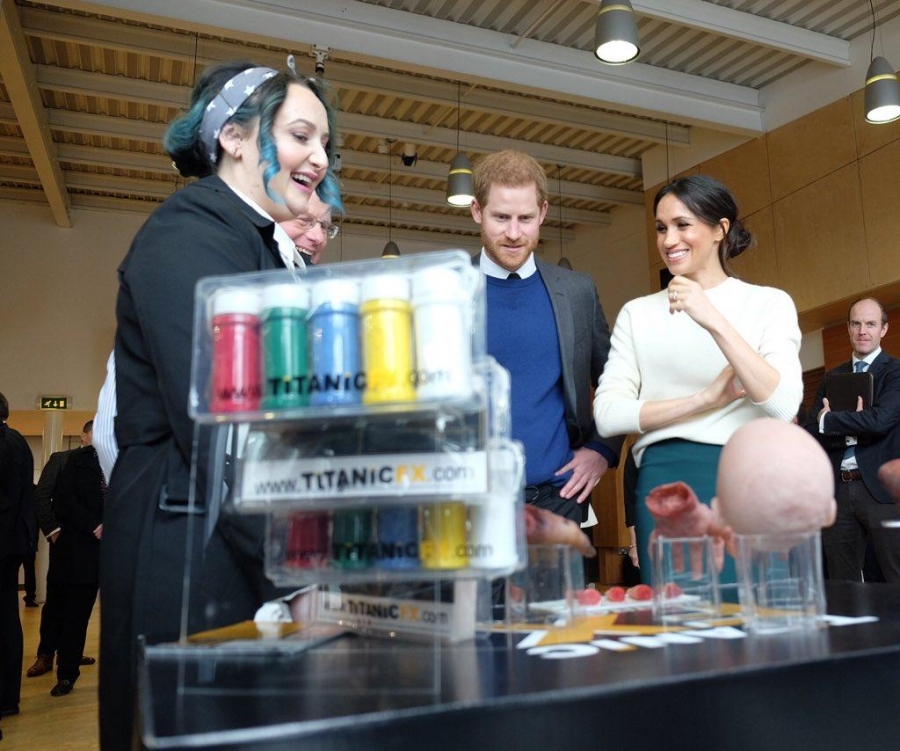 Hoàng tử Harry và công nương Markle tới Catalyst, Inc vào tháng ba năm nay. Trong ảnh, họ đang gặp gỡ startup Titanic FX, nơi sản xuất nguyên liệu cho việc hóa trang tạo hiệu ứng đặc biệt trên phim trường. Ảnh: Catalyst, Inc.