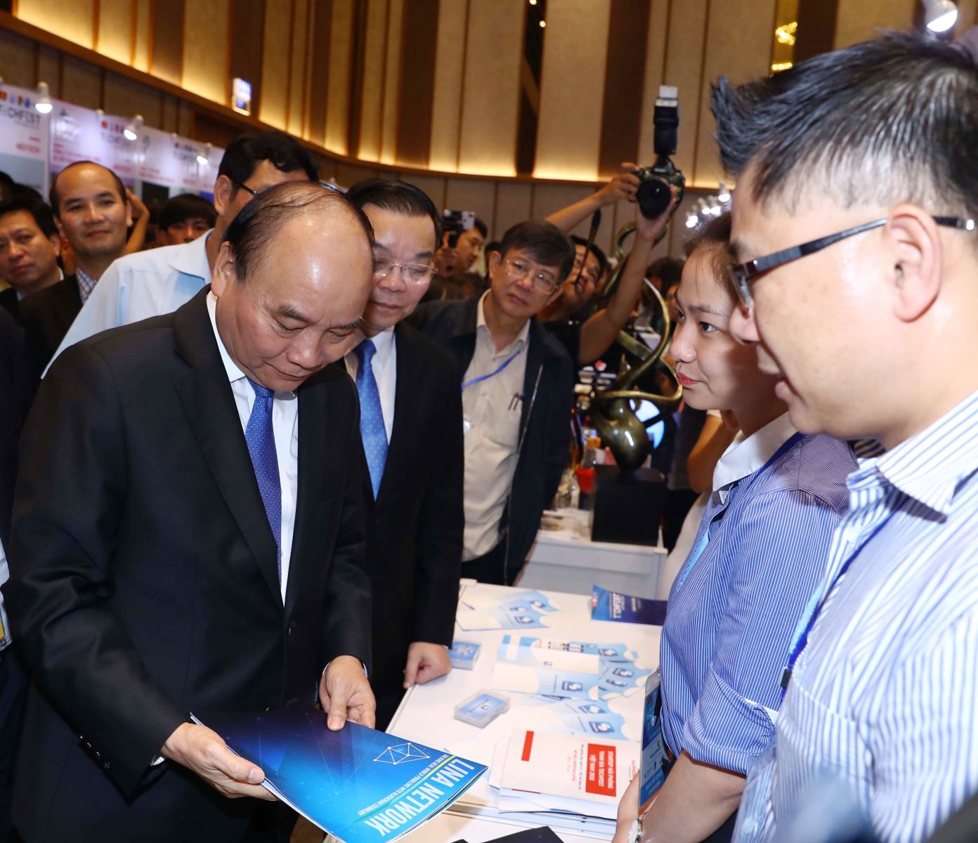 Thủ tướng và các đại biểu tham quan gian hàng giới thiệu công nghệ của startup.