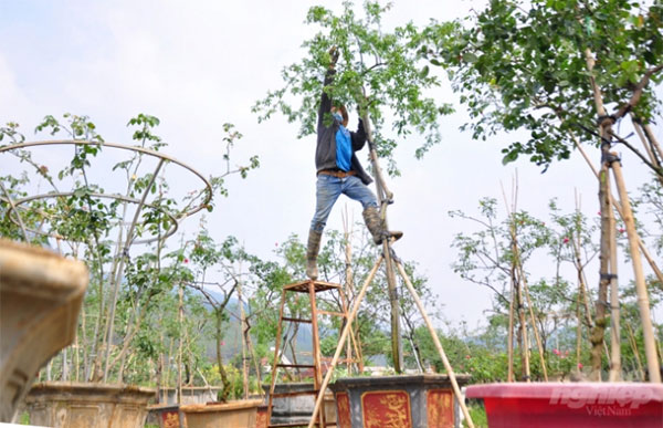 Với tay lên kiểm tra nụ của cây hồng đào 50 năm tuổi, anh Trọng tỏ vẻ tâm đắc: “Cây này quý. Tôi gọi nó là cây ngũ phúc vì có 5 cành lớn tỏa ra 5 hướng. Tuổi cao, thân sần sùi nhưng chồi non vẫn mơn mởn, hoa nở đều và đẹp lắm. Có người đến thăm, thấy thích nên ngỏ ý trả giá gần trăm triệu đồng nhưng tôi chưa bán”.
