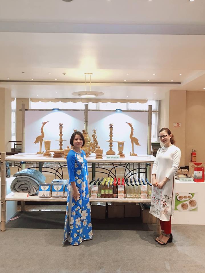Bà chủ thương hiệu Giấm Kim Ngân (áo dài hoa) đang giới thiệu sản phẩm