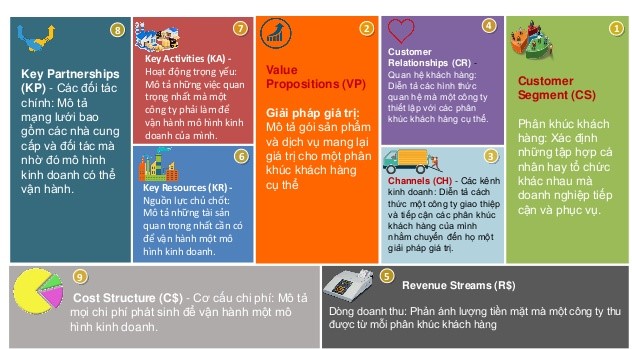 Business model canvas (BMC) được phát triển bởi chuyên gia quản trị người Thuỵ Điển Alexander Osterwalder. Ông đã sử dụng 9 nhóm nhân tố chính cấu thành nên BMC, mà ông hàm ý chúng chính là 9 trụ cột tạo nên tổ chức của một công ty, gồm có: Phân khúc khách hàng, Giải pháp giá trị, Các kênh kinh doanh, Quan hệ khách hàng, Dòng doanh thu, Nguồn lực chủ chốt, Hoạt động trọng yếu, Các đối tác chính, Cơ cấu chi phí.