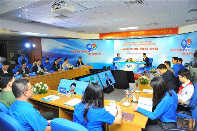 Đồng chí Nguyễn Anh Tuấn, Ủy viên Trung ương Đảng, Bí thư thứ nhất Trung ương Đoàn, Chủ tịch Hội LHTN Việt Nam đối thoại trực tuyến với các đoàn viên, thanh niên trong và ngoài nước. Ảnh: Minh Đức/TTXVN.