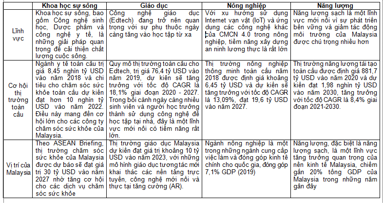 Đòn bẩy này gồm 4 lĩnh vực: khoa học sự sống, giáo dục, nông nghiệp và năng lượng được trình bày trong Bảng 1.