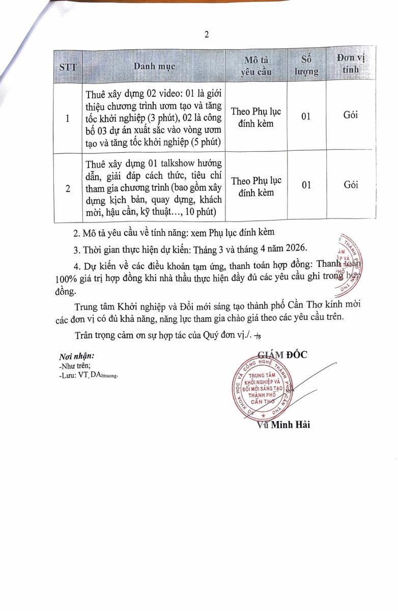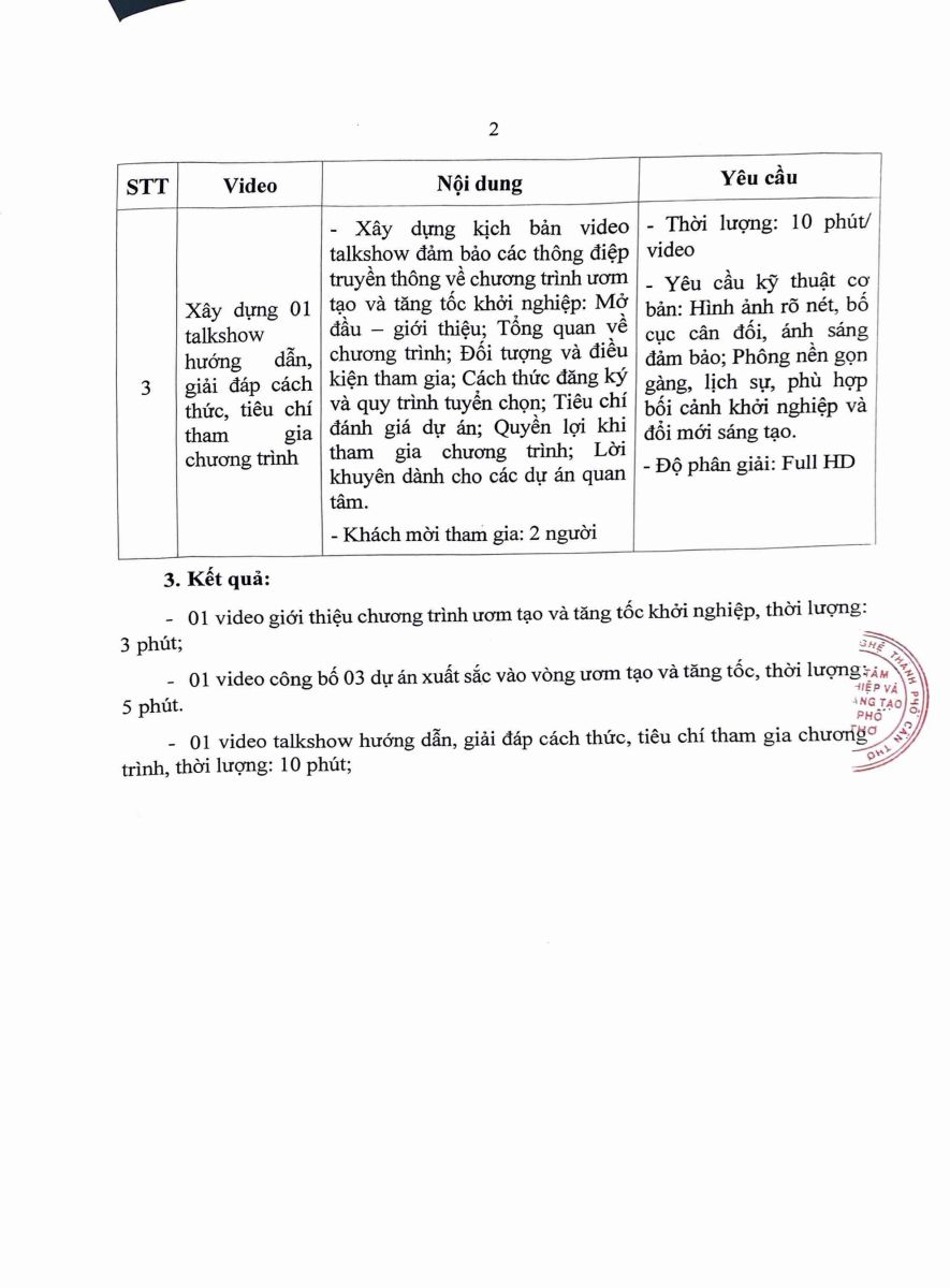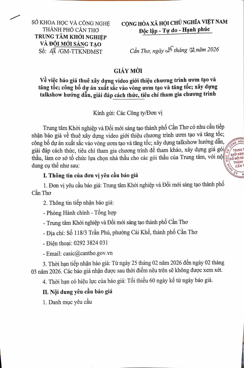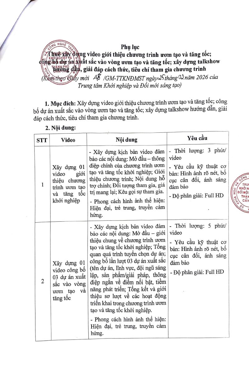 Mời chào giá thuê xây dựng video giới thiệu chương trình ươm tạo và tăng tốc; công bố dự án xuất sắc vào vòng ươm tạo và tăng tốc; xây dựng talkshow hướng dẫn, giải đáp cách thức...
