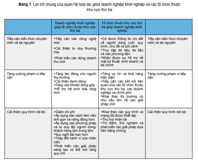 Quan hệ hợp tác giữa doanh nghiệp khởi nghiệp và các tổ chức thuộc khu vực thứ ba có thể đưa đến những lợi ích chung, trong đó các tổ chức thuộc khu vực thứ ba có thể khai thác ý tưởng và cách thức làm việc sáng tạo của doanh nghiệp khởi nghiệp trong khi các doanh nghiệp khởi nghiệp, dựa vào sự hỗ trợ của các tổ chức thuộc khu vực thứ ba, có thể mở rộng quy mô.