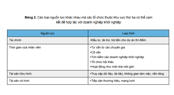 Các phương thức hợp tác khác nhau cần mức độ cam kết tài nguyên khác nhau. Bảng 2 minh họa các loại nguồn lực (tài chính, thời gian, tài sản) có thể cần cam kết cho sự hợp tác với doanh nghiệp khởi nghiệp.