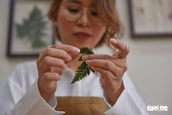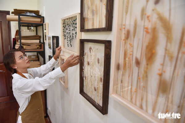 Hoa, lá tươi ép khô được chị Trinh dán keo 2 mặt trước khi đưa vào khung - Ảnh: Ngọc Phượng