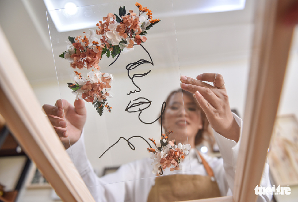 Từng làm nhân viên kinh doanh có mức thu nhập tốt, nhưng chị Phương Trinh quyết định chuyển hướng sang kinh doanh dòng tranh canvas. Chị đã bắt đầu nghiên cứu và cho ra đời dòng tranh hoa lồng kính được thiết kế và làm hoàn toàn thủ công.