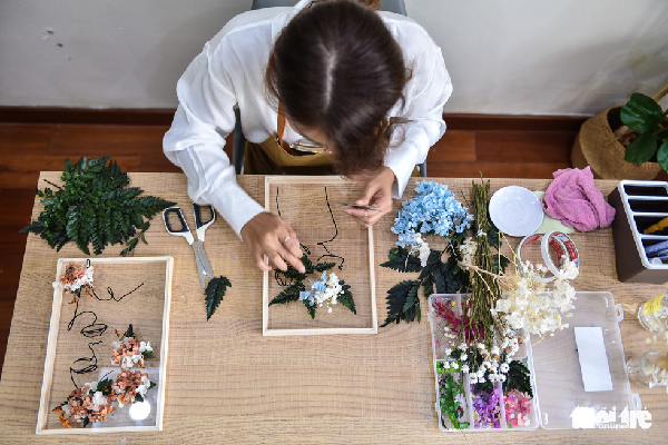 Phải mất gần 6 tháng để chị Trinh nghiên cứu các công đoạn, thời điểm đó trên thị trường vẫn chưa có nguồn nguyên liệu, chị tự tìm kiếm hoa tươi mang về và xử lý khô, lên màu và thiết kế mẫu riêng.