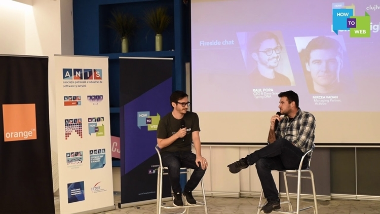 CEO của TypingDNA - Raul Popa (trái) chia sẻ về nền tảng nhận diện cá nhân qua cách đánh máy tại một sự kiện. |