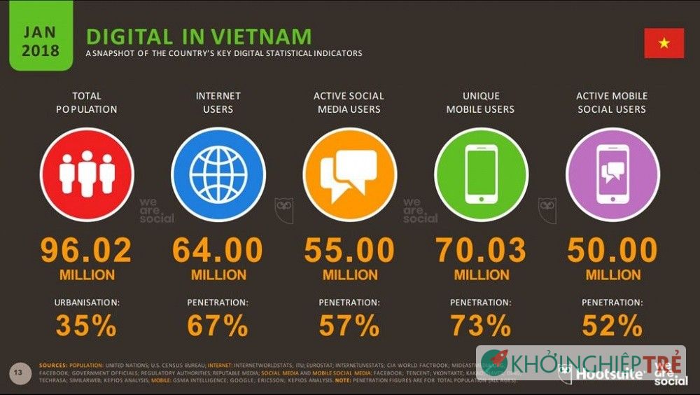 Theo báo cáo 2018 Digital Yearbook công bố tháng 1/2018, với tổng số dân là 96,02 triệu người, tại Việt Nam đang có 64 triệu người dùng Internet, chiếm 67% dân số và tăng 28% so với tháng 1/2017. Có 55 triệu người dùng tích cực (Active Users) trên truyền thông xã hội (Social Media), chiếm 57% dân số và tăng 20% so với tháng 1/2017. 94% người sử dụng Internet hằng ngày và thời gian trung bình sử dụng Internet trên tất cả các thiết bị là 6 giờ 52 phút mỗi ngày.