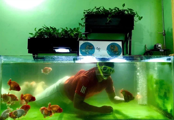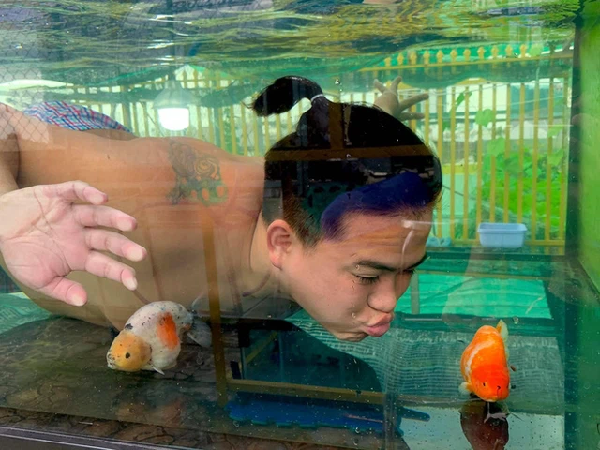 Thắng ngụp lặn trong bể cá để chơi đùa với "thú cưng" hoặc vệ sinh bể.