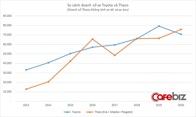 Thaco chỉ mất thêm 2 năm để đạt được mong muốn này của Chủ tịch Dương. Năm 2016, Thaco bán được tổng cộng tới gần 113.000 xe, nắm 41,5% thị phần. Trong đó, doanh số Kia và Mazda là hơn 65.000 xe, bỏ xa Toyota năm đó bán được 57.000 xe. Các năm sau đó là cuộc rượt đuổi gay cấn giữa Thaco và Toyota, khi cả hai liên tục so kè với nhau trên thị trường. Năm 2020 vừa qua, bất chấp ảnh hưởng của dịch bệnh Covdi-19, 3 thương hiệu xe của Thaco một lần nữa vượt lên với gần 76.000 xe, con số lớn nhất từ trước tới nay, trong khi Toyota là gần 71.000 xe.