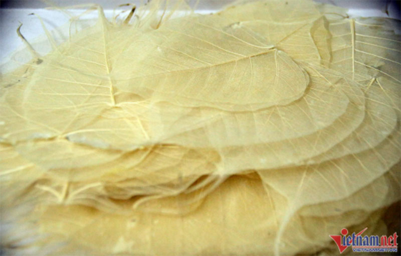 Lá khô cô dùng sẽ là lá bồ đề, lá bàng hay bằng lăng vì đây là những loại có gân. Việc chọn lá cũng lắm công phu, theo cô, cây được chọn cần mọc ở những nơi đất khô cằn, lúc này gân mới chắc, lá cũng phải già, lá tốt nhất là loại đã rụng dưới gốc cây.