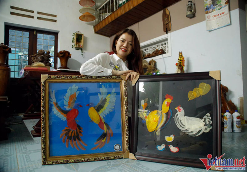 Cô kể: “Ngoài những lá bồ đề làm ra để trang trí, tôi sẽ sáng tạo những bức tranh có kích cỡ khác nhau tùy thuộc vào khách hàng đặt như 20x20cm, 100x100cm. Mỗi bức tranh lại mang nhiều nội dung khác nữa, có thể rồng, gà, chim…”.