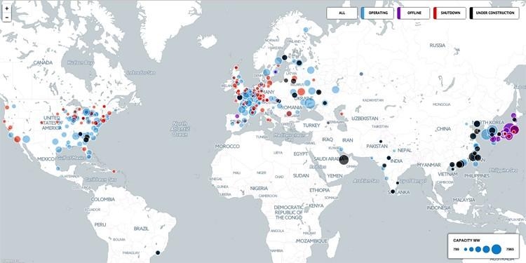 437 là số lò phản ứng hạt nhân hoạt động trên khắp thế giới. Trong đó số lò phản ứng nước nhẹ chiếm đến 359 lò (theo số liệu năm 2009 của Cơ quan Năng lượng Nguyên tử Quốc tế IAEA). Màu xanh biểu thị các lò hiện đang hoạt động, màu tím là đang tạm ngưng, màu đỏ là không còn hoạt động nữa, màu đen là đang xây dựng mới.