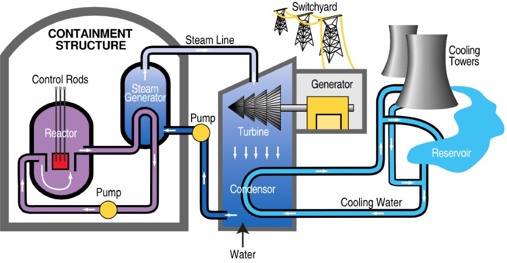 Sơ đồ đơn giản của nhà máy phát điện hạt nhân nước nhẹ với các dấu mũi tên biểu thị các chu trình khép kín. Bắt đầu từ lò phản ứng tạo nhiệt lượng, đun nóng nước dạng lỏng để tạo hơi nước áp suất cao làm quay động cơ máy phát điện, cùng lúc hệ thống làm mát làm cho hơi nước nóng trở lại nước dạng lỏng để hoàn thành chu trình. Giải thích: Lò phản ứng (Reactor) và lõi phản ứng hạt nhân màu đỏ, Hệ thống các thanh điều khiển (Control Rods), Buồng tạo hơi nước (Stream Generator), Ống dòng mang hơi nước (Stream line), Máy phát điện (Generator), Tua-bin phát điện (Turbine), Nước làm mát (Cooling Water), Tháp làm mát bằng nước (Cooling Tower), Hồ chứa (Reservoir), Nơi hoá lỏng nước (Condensor), và cùng các Máy bơm (Pump).
