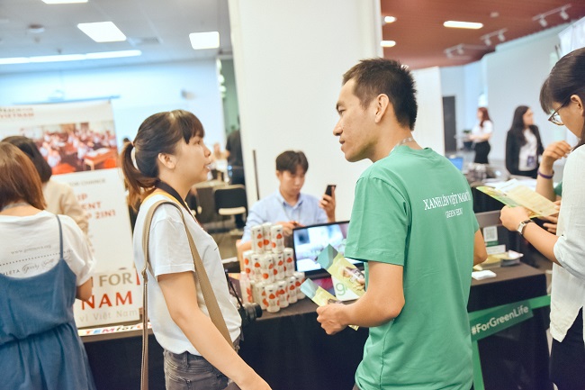 Các bạn trẻ chia sẻ chuyện khởi nghiệp xã hội tại các gian hàng trưng bày trong khuôn khổ Diễn đàn.