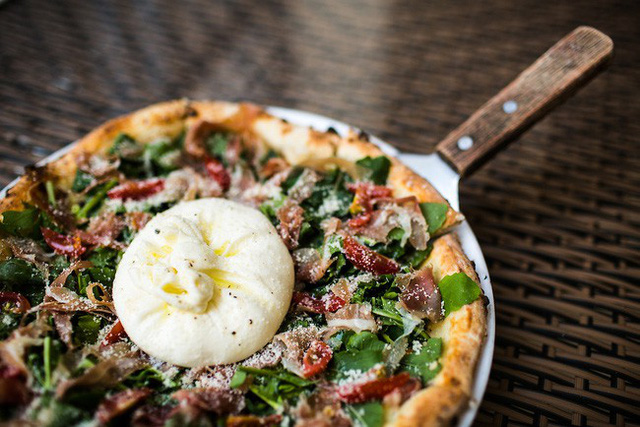 Phomai tươi Burrata đặt trên miếng bánh pizza