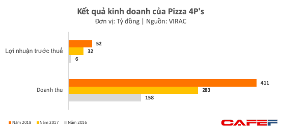 Theo dữ liệu của VIRAC, doanh thu của Pizza 4P's trong năm 2017 đạt hơn 283 tỷ, tăng 79% so với năm trước đó. Đồng thời lợi nhuận tăng vọt lên gần 33,3 tỷ đồng, gấp hơn 6 lần so với mức 5,5 tỷ đồng của năm 2016.