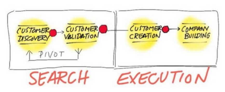 Tính chất đặc thù của bước 1 & 2 là “TÌM KIẾM” (SEARCH). Tìm kiếm điều gì? Tìm kiếm mô hình kinh doanh có thể tái lặp & nhân rộng. Startup phải điều chỉnh, thay đổi rất nhiều lần trước khi có được sản phẩm phù hợp thị trường (product/market fit) là hết sức bình thường.