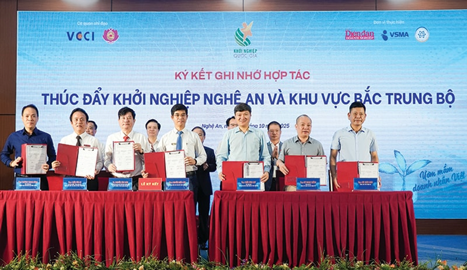 Doanh nghiệp đi trước không chỉ đóng vai trò nhà đầu tư mà còn là “khách hàng đầu tiên”. (Ảnh: Doanh nhân Trần Văn Lê (thứ 2 từ trái sang) tại Lễ ký kết hợp tác thúc đẩy khởi nghiệp Nghệ An và khu vực miền Trung)