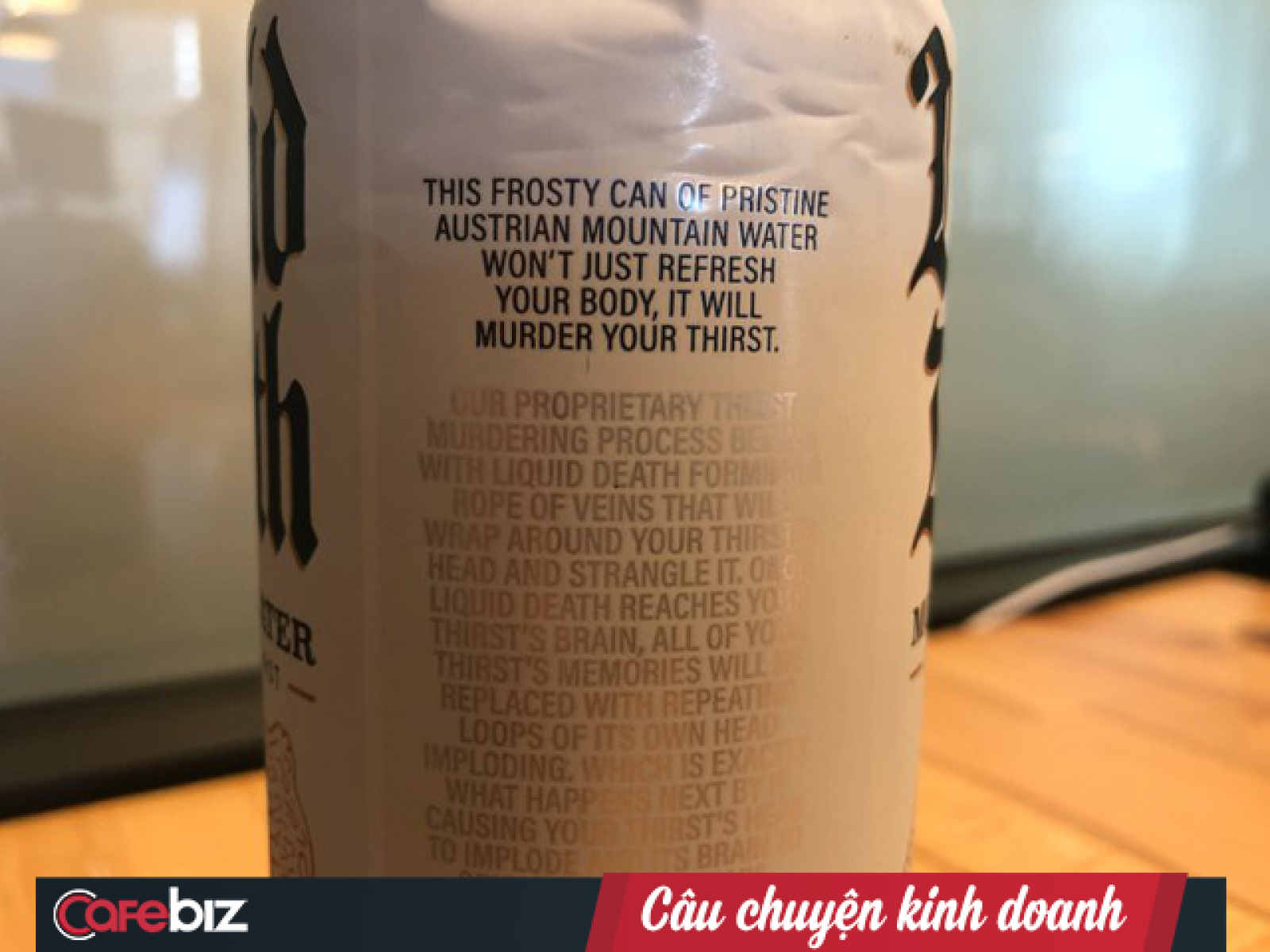 "Lon đựng nước mát lạnh lấy từ những ngọn núi của nước Áo này sẽ không chỉ thanh lọc cơ thể bạn mà còn giết chết cơn khát trong bạn"- Lời quảng cáo mỹ miều trên vỏ Liquid Death