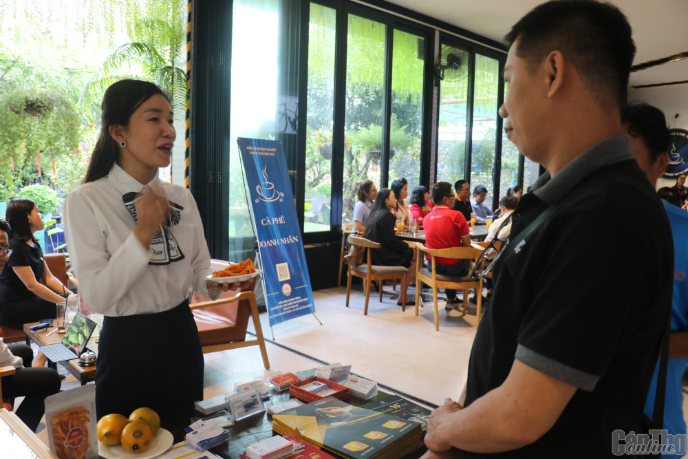 Chị Đỗ Thị Xuân Diệu giới thiệu sản phẩm từ lêkima tại chương trình “Cà phê doanh nhân” do Hiệp hội Doanh nghiệp TP Cần Thơ tổ chức đầu tháng 10-2022.