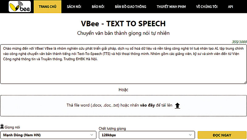 Truy cập vào ứng dụng của Vbee, chị Trang chỉ cho tôi các ứng dụng cụ thể của công nghệ text to speech mà startup của chị đang phát triển như báo nói, đọc truyện, bản đồ giao thông Vadi, thuyết minh phim. Trên giao diện chính, chị Trang gõ một đoạn văn bản bất kỳ vào phần trải nghiệm và ngay lập tức, hệ thống trả về giọng đọc nam chuẩn Hà Nội với ngắt nghỉ dấu câu gần như chính xác. Nếu không biết đây là hệ thống hoàn toàn do máy chuyển đổi, chắc hẳn tôi đã nghĩ có một người nào đó ngồi trực hệ thống để đọc.